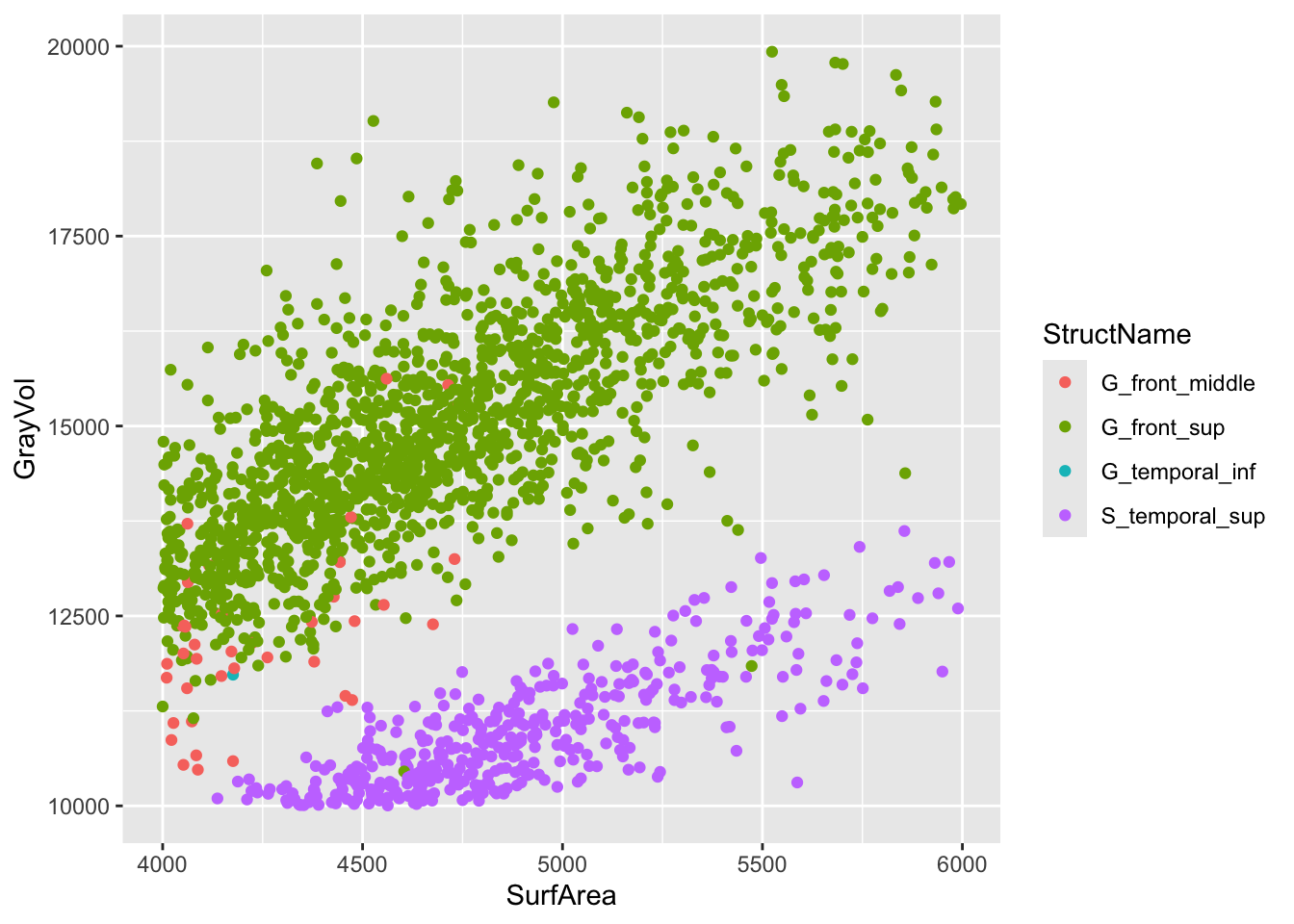 Clearly, there are groupings in the data. These groupings could partly be driven by participant demographics (e.g., some participants having larger or smaller regional volumes), but they may also be driven by different structures (e.g., the relationship between surface area and volume may differ across regions). Let’s zoom in on two of the larger clusters, and color the points by structure.
